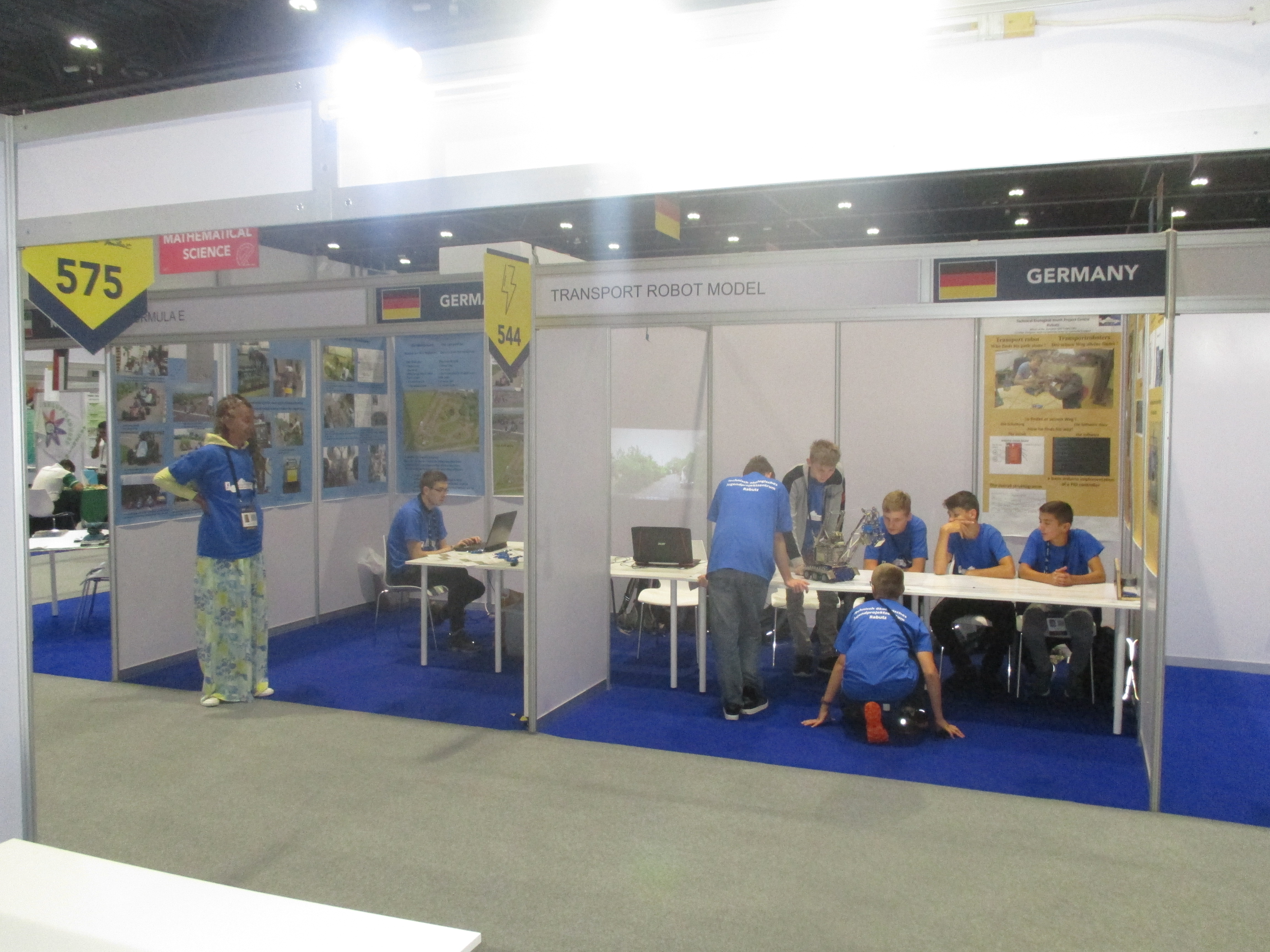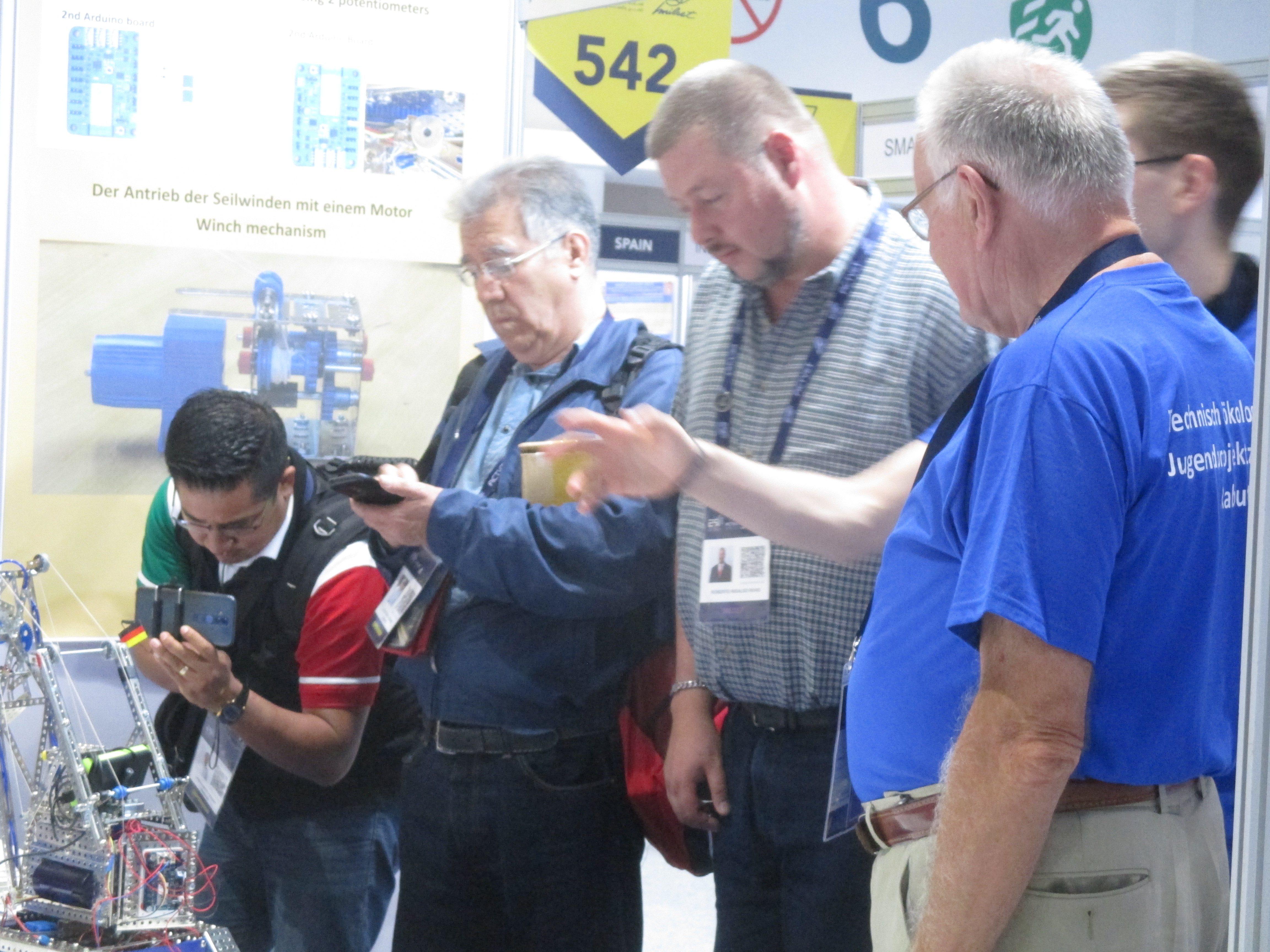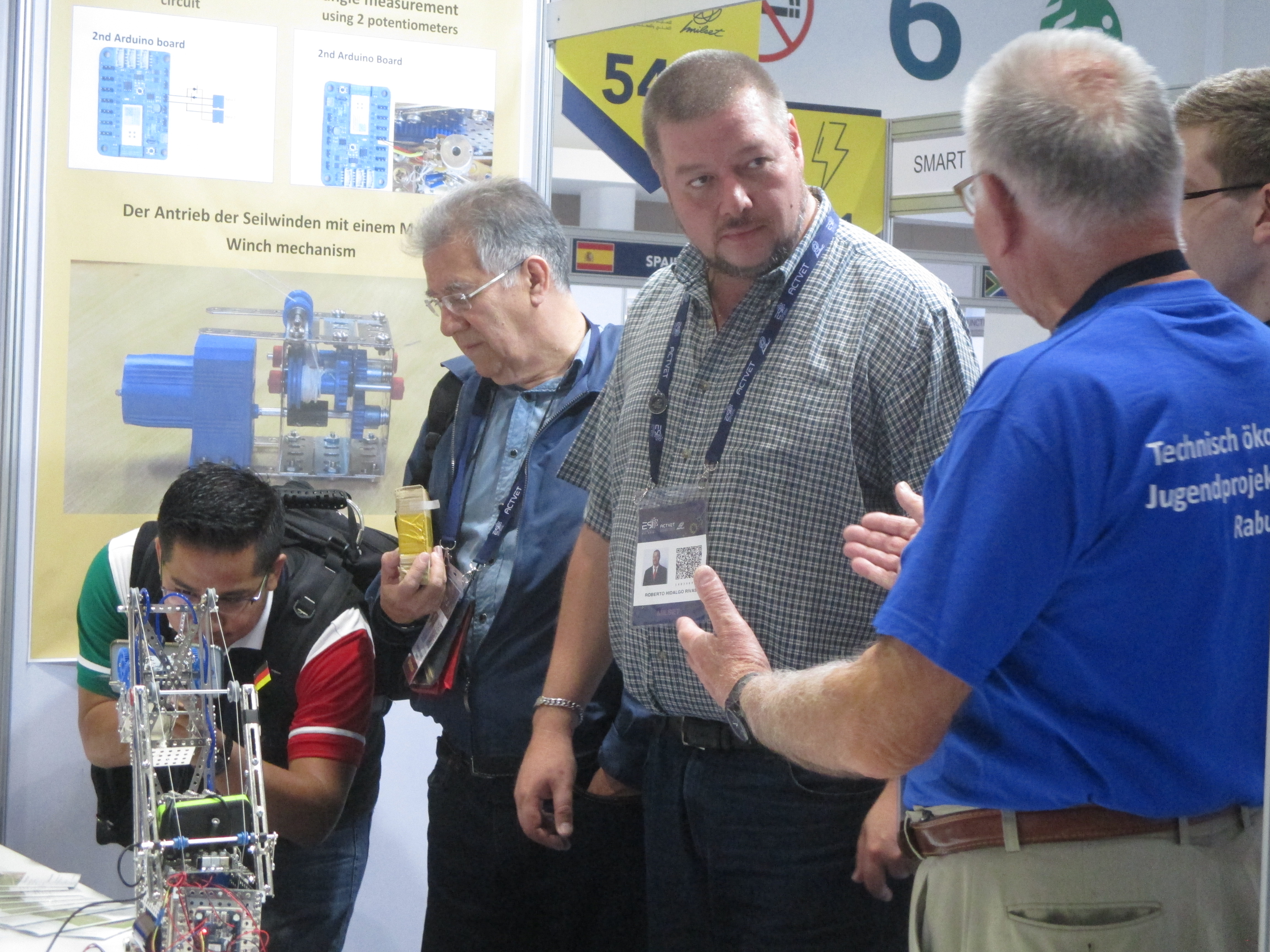 Jose, der Leiter der nächsten ESI in Mexiko interessierte sich besonders für das Exponat Transportroboter. Besonders interessant war für ihn, dass wir das Gerät mit einem ganz normalen Metallbaukasten konstruiert haben. Natürlich ist das besonders gut möglich mit den Baukästen der Thüringer Firma Eitech. Diese Baukästen verfügen nur ganz wenig über halbfertige Baugruppen und sind damit für kreative Arbeit besonders gut geeignet. Die erforderliche Steuer-Platine auf Arduino-Basis wird ebenfalls von Eitech geliefert.
